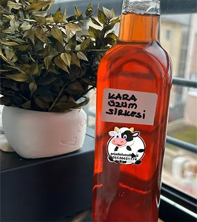 Sofralık kara üzüm ve doğal bal ile elde edilmiş koyu renkli ve güçlü bir sirke.