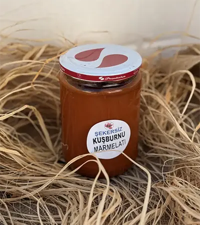 Kuşburnunun doğal ekşi tadıyla hazırlanmış, ilave şeker içermeyen marmelat.